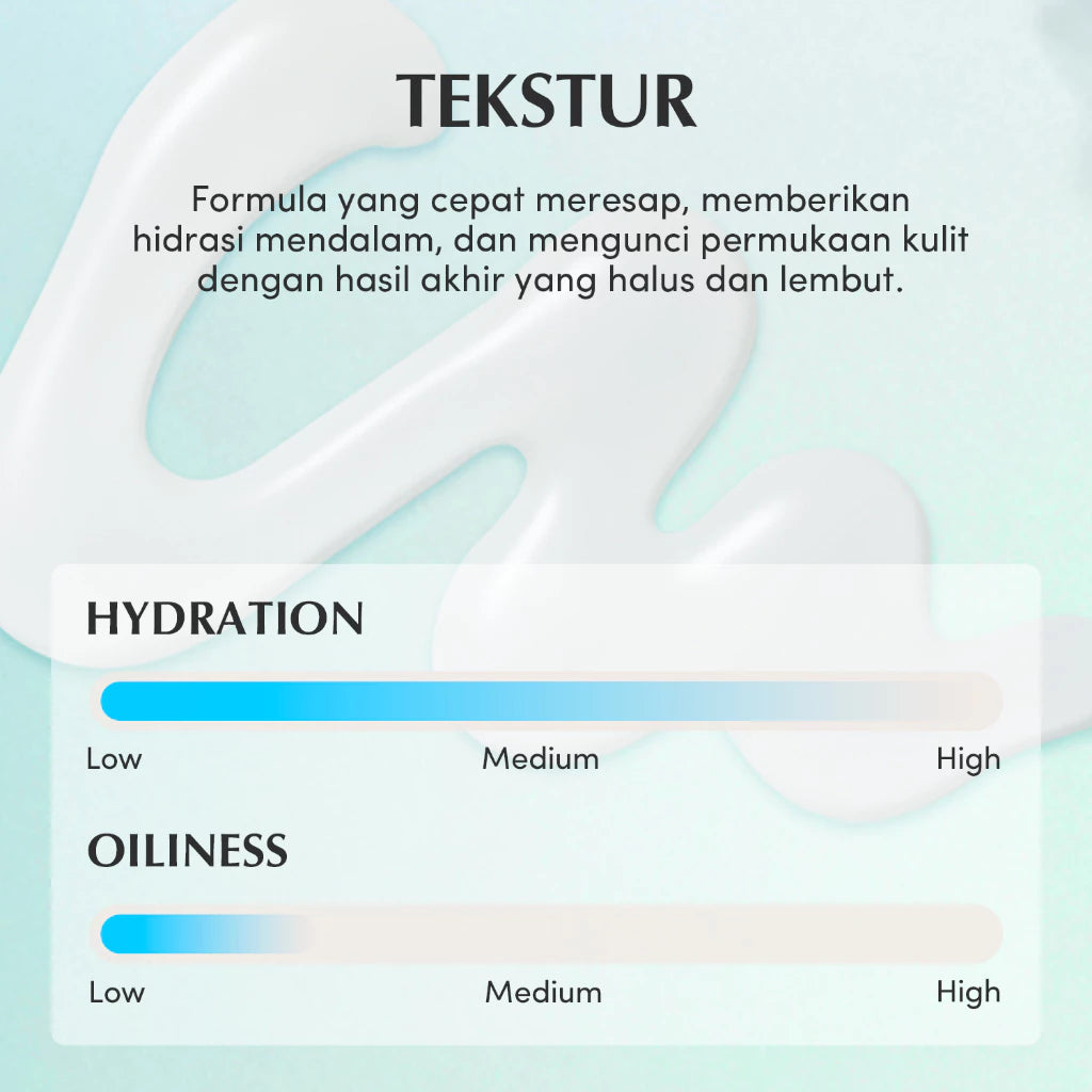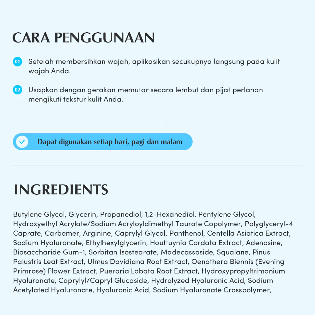 - 8-Layer Hyaluronic acid (High molecular weight - Protects moisture barrier / Medium molecular weight - Strengthens moisture barrier / Low molecular weight - Relieves dryness)